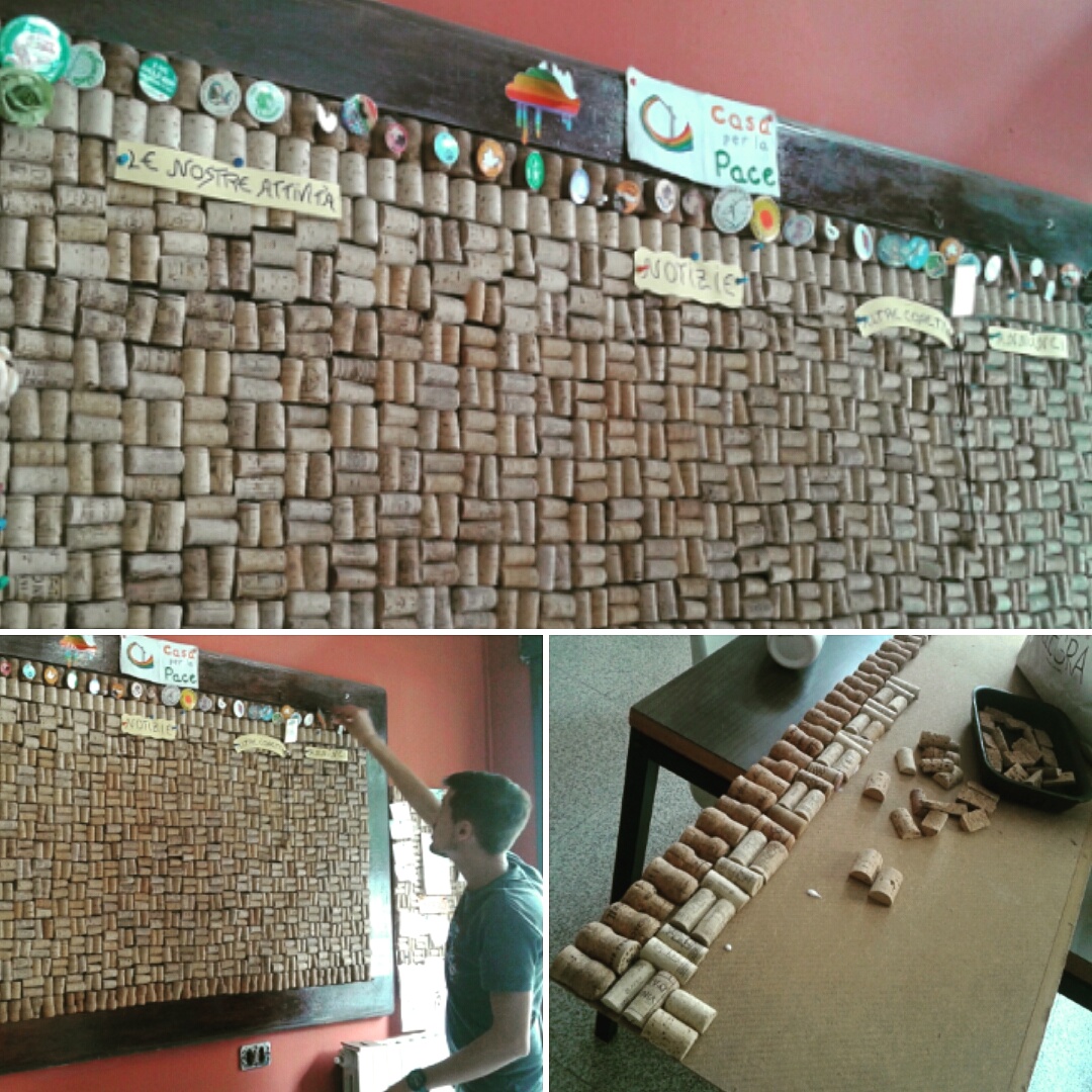 In Casa per la Pace we are doing some wonderful things from recycled items, for example, useful bulletin boards (which can turn into hot pads depending on size) from wine corks. As I like to work with stained glass, I decided to recycle little used bottles like the ones from pesto or jam and turned them in little lanterns. We also recycle radiograms to turn them into stencils with witty inscriptions to use on T-shirts, fabric of broken umbrellas to make shopping bags… I learned that I can use recycled colour paper for quilling instead of buying a special one for this craft and that I can recycle even an old book which was on the way to garbage and turn it in a beautiful drawing.