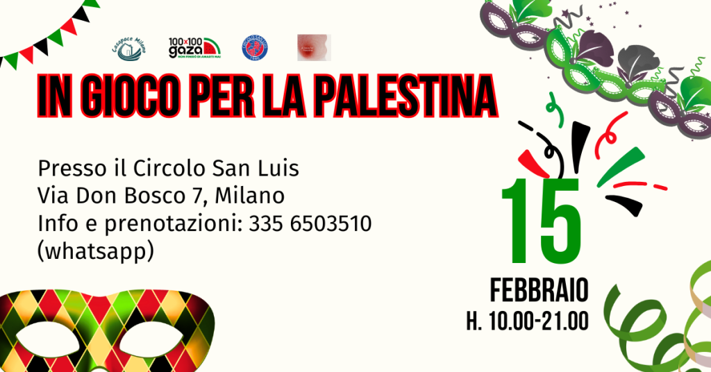 Nell’ambito della campagna di solidarietà 100×100 Gaza, Casa per la Pace Milano, il Circolo San Luis 1946 e Doula for Palestine vi invitano a una giornata di incontro e condivisione, nel segno di un carnevale solidale.